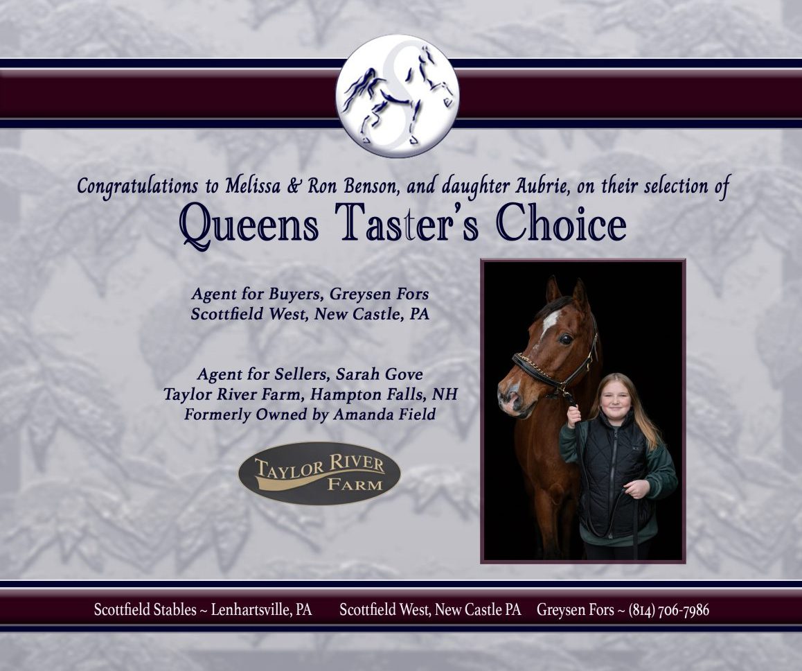 Congratulations to the Benson family on their selection of Queens Taster’s Choice! Agent for Buyers, Greysen Fors, Scottfield West. Agent for Sellers, Sarah Gove, Taylor River Farm, LLC. With many thanks to former owner, Amanda Field, for making this special horse available to us!!