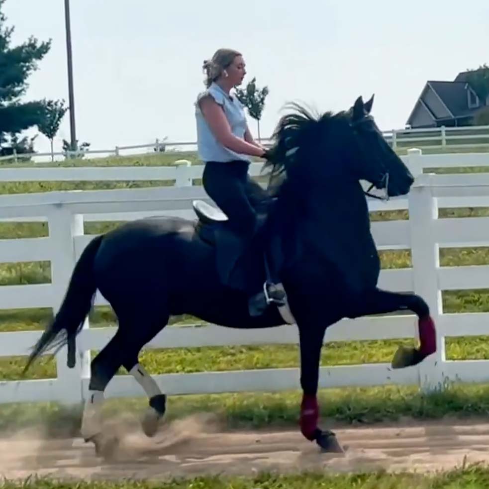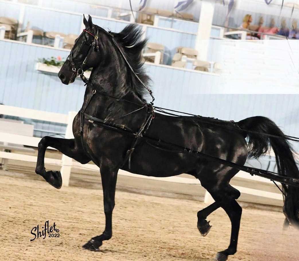 A 16.h black Saddlebred gelding who has been thoughtfully brought along and just made his show ring debut this spring in the Park Pleasure division as the Reserve Grand Champion Park Pleasure at the 2024 UPHA Spring Premiere. “Armand” is trustworthy under saddle and in harness and wants to be a point and shoot, uncomplicated, solid citizen for your amateur rider. Easy flat walk, smooth gaits, and a forgiving mouth, he will help your unbalanced rider and has the patience for a rider to learn on. Or give him a seasoned rider and just go dominate the pleasure divisions right out of the gate!