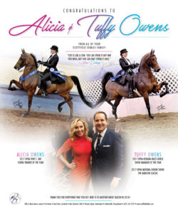 Alicia Owens was voted the 2016 People’s Choice Instructor of the Year following a fantastic 2016 season that included a unanimous World Championship win at Louisville with Sarah Hecht and her Saddlebred mare, Novella, in the 13 & Under Five Gaited division. That win was followed up with Sarah and her Morgan, Dragonsmeade Varvatos, being crowned Reserve World Champions in the Junior Exhibitor Park Saddle World Championship and the 15 & Under Park Saddle Grand National Champions. Also bringing back a Grand National Championship was Maddie Sappenfield and her beloved MEM I’m Back in the 14-15 Hunter Pleasure Grand National class. This sporty team went back in the 14-17 Hunter Pleasure Championship where they earned the Reserve World Championship roses and tricolor. Making history by being the only rider in the history of the Morgan breed to win the Junior Saddle Seat Equitation World Championship three times (2014-2016), long time Scottfield student Audra Lee and her fabulous mare, CBMF Random Hearts GCH, were the unanimous winners of the Junior Saddle Seat Equitation World Championship again this year, closing out their Junior Equitation career having never lost a world title in the Morgan Junior Equitation division, including the UPHA Junior Challenge Cup Finals in 2014. Audra is the youngest rider to have ever won that title, as well, having won that National Finals at the age of 11. This is the second time Alicia has been honored by professionals and owners within the industry with a People’s Choice win, having been the Reserve Instructor of the Year in 2010.