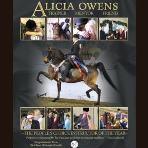 Alicia Owens was voted the 2016 People’s Choice Instructor of the Year following a fantastic 2016 season that included a unanimous World Championship win at Louisville with Sarah Hecht and her Saddlebred mare, Novella, in the 13 & Under Five Gaited division. That win was followed up with Sarah and her Morgan, Dragonsmeade Varvatos, being crowned Reserve World Champions in the Junior Exhibitor Park Saddle World Championship and the 15 & Under Park Saddle Grand National Champions. Also bringing back a Grand National Championship was Maddie Sappenfield and her beloved MEM I’m Back in the 14-15 Hunter Pleasure Grand National class. This sporty team went back in the 14-17 Hunter Pleasure Championship where they earned the Reserve World Championship roses and tricolor. Making history by being the only rider in the history of the Morgan breed to win the Junior Saddle Seat Equitation World Championship three times (2014-2016), long time Scottfield student Audra Lee and her fabulous mare, CBMF Random Hearts GCH, were the unanimous winners of the Junior Saddle Seat Equitation World Championship again this year, closing out their Junior Equitation career having never lost a world title in the Morgan Junior Equitation division, including the UPHA Junior Challenge Cup Finals in 2014. Audra is the youngest rider to have ever won that title, as well, having won that National Finals at the age of 11. This is the second time Alicia has been honored by professionals and owners within the industry with a People’s Choice win, having been the Reserve Instructor of the Year in 2010.